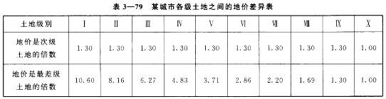 该城市土地分为10个级别,城市边缘熟地列为最差级,即处于第10级土地上,而估价对象房地产处于第6级土地上,因此,还需要进行土地级别对地价影响的调整。各级土地之间的地价差异见表3—79。