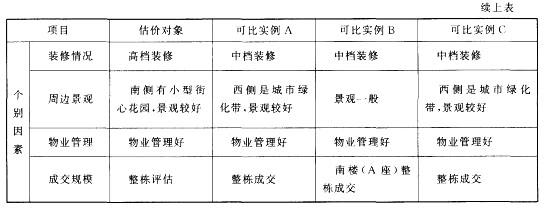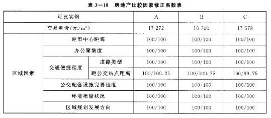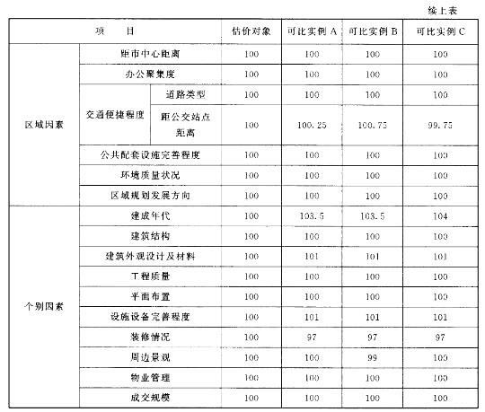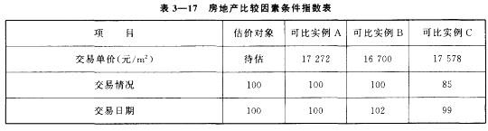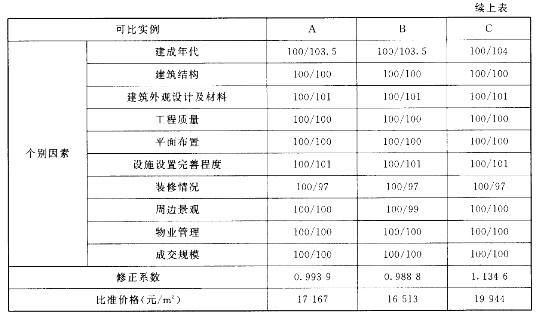 (3)区域因素及个别因素修正(区域因素指数、个别因素指数确定过程略)经比较得出房地产比较因素条件指数表,见表3—17。