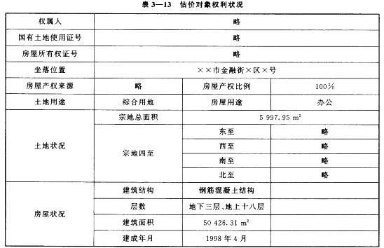 估价对象位于XX市金融街X区X号,于1998年4月建成,为钢筋混凝土结构,地上十八层,标准层标高3.2m/3.6m/4.5m;地下三层,层髙2m。根据委托人提供的资料及估价人员的现场查勘,建筑物结构、装修、设备及现状使用情况为:大厦外墙一~四层为棕色花岗石饰面,四层以上为铝合金玻璃幕墙;西北面、东南面两个主人口均采用高级进口材料装修,设有自动旋转门。双大堂均为挑空结构,二层围绕挑空大堂设计有回廊。