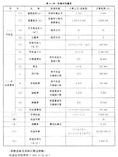 根据租赁合同,月租金为65元/m2,期间不调整租金,且租赁合同到期后资产经营公司可优先续租,因此本次评估月租金取65元/m2,空置率取0。根据估价对象房屋造价审计报告,经造价指数修正和成新修正后,确定房屋重置成本为1200元/m2(测算过程略)。