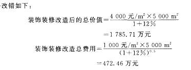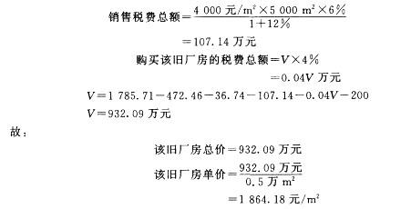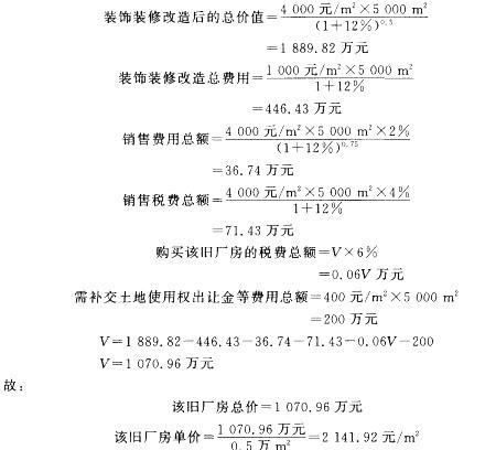 某旧厂房的建筑面积为5000m2。根据其坐落地点和周围环境,适宜装饰装修改造成商场出售,并可获得政府批准,但需补交土地使用权出让金等费用400元/m2(按建筑面积计),同时取得40年的土地使用权。预计装饰装修改造期为1年,装饰装修改造费用为每平方米建筑面积1000元;装饰装修改造完成后即可全部售出,售价为每平方米建筑面积4000元;在装饰装修改造完成前半年开始投入广告宣传等销售费用,该费用预计为售价的2%;销售税费预计为售价的6%;购买该旧厂房买方需要缴纳的税费为其价格的4%。请利用上述资料采用现金流量折现法测算该旧厂房的正常购买总价和单价(折现率为12%)。