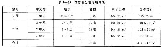 B.6号、7号住宅楼建成于1996年,共计96套住宅,总建筑面积9458.96m2,已销售、处置63套。本报告仅对剩余的33套住宅进行估价,建筑面积3361.17m2,南北朝向,内墙抹灰,水泥地面,铝合金窗,外墙刷涂料,有水、电、暖等配套设施。详细情况见表3—55。