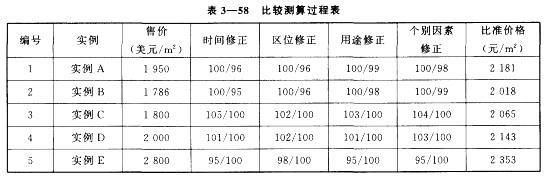由于估价对象预期建设为高级综合性商用楼,而目前某市房地产市场上此类物业的交易实例可比性资料较多,故采用市场比较法可确定评估地块的物业售价。具体比较测算过程见表3一58。