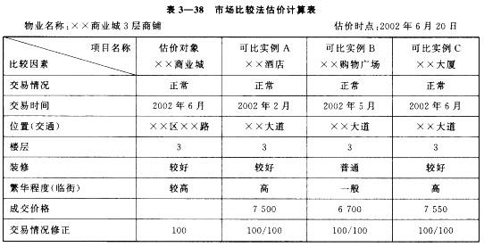 由于同类物业的市场交易案例较多,选择与估价对象状况最为类似的三个可比实例作为参照,经过充分考虑各物业的差异并作出修正后,得出估价对象的价值。具体估价测算过程如下: