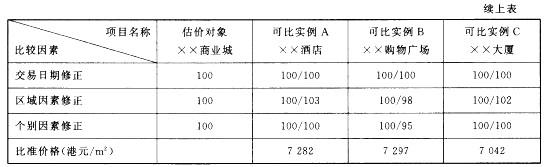 平均比准价格单价=(7282+7197+7402)港元/m2+3=7294港元/m2故采用市场比较法估价XX商业城3层3001~3009号商铺的公开市场价值总额为: