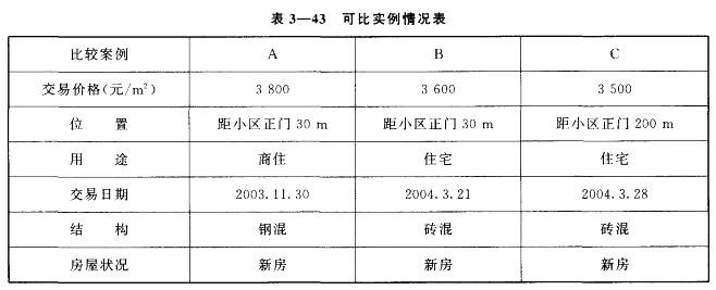 评估选择了与估价对象同一小区内,三宗交易实例作为比较案例,具体情况见表3—43。