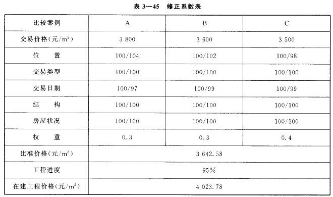 根据修正指数表,编制修正系数表见表3—45,最后依据市场比较法计算公式求取修正后的房产价格。