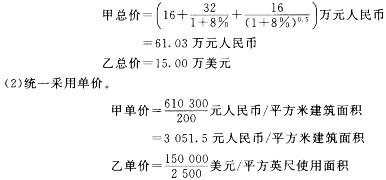 (5)统一面积单位。如果以平方米为基准,由于1平方英尺=0.09290304平方米,则甲单价=3051.5元人民币/平方米建筑面积