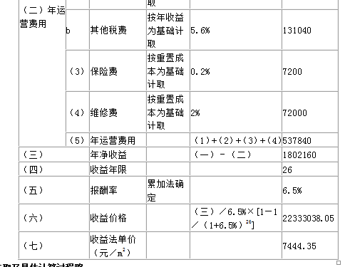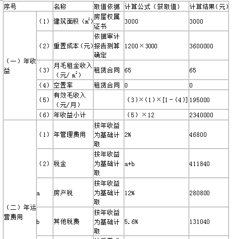 根据租赁合同,月租金为65元/m2,期间不调整租金,且租赁合同到期后资产经营公司可优先续租,因此本次评估月租金取65元/m2,空置率取0。根据估价对象房屋造价审计报告,经造价指数修正和成新修正后,确定房屋重置成本为1200元/m2(测算过程略)。