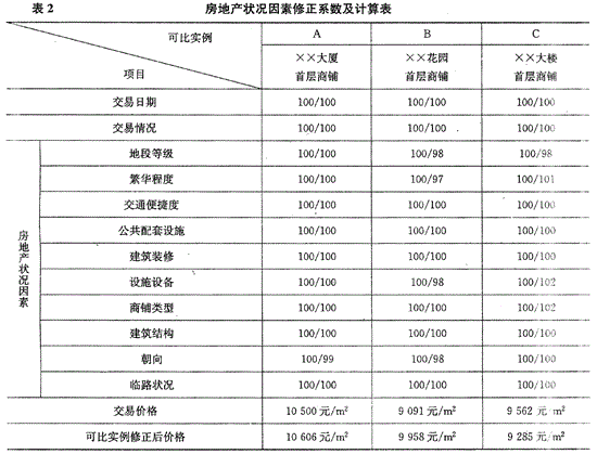 ③房地产状况因素调整:根据商业用房的特点,选取繁华程度、交通便捷度、公共配套设施完备程度等因素,以估价对象的状况为100,将可比实例与估价对象状况因素进行打分比较,比较结果见表2。