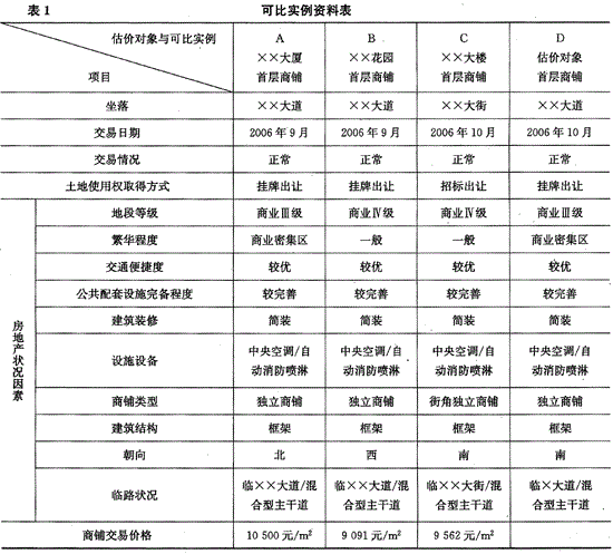 选取与估价对象房地产所处地区相近,结构及用途相同,建筑面积相近,均为首层的3个交易案例作为估价对象的可比实例,有关资料见表1。