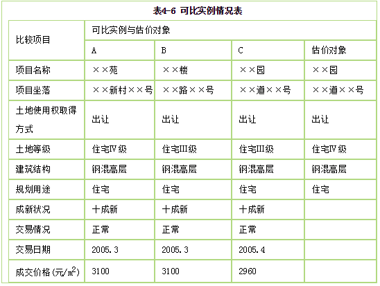 根据可比实例的具体情况,可比实例A、B、C的区域因素略好于估价对象。将区域因素调整的主要内容与估价对象进行打分比较。得到可比实例A、B、C区域因素调整系数分别为:100/101、100/102、100/103(具体比较情况见表二)。