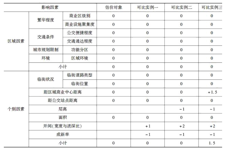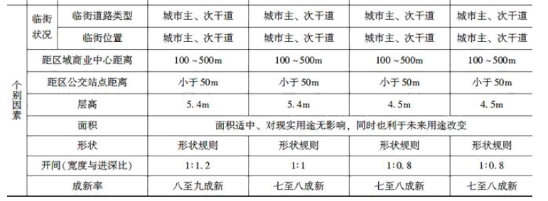 估价对象为商业房地产,根据目前房地产市场特点,本次选取的区域因素包括繁华程度、交通条件、城市规划限制和环境等。个别因素包括临街状况、距区域商业中心距离、距公交站点距离、层高、面积、形状、开间、成新率等。