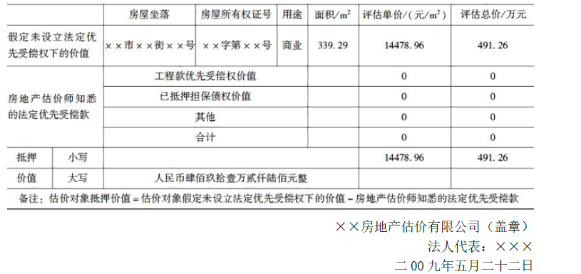 我公司派注册房地产估价师到估价对象所在地进行实地查勘和市场调查,估价人员在结合有关资料的基础上,遵循估价原则,按照估价程序,运用科学的估价方法,分析了影响房地产价格的各项因素,经过测算并结合估价人员经验,确定估价对象于估价时点2009年4月21日满足本报告估价“假设和限制条件”下的抵押价值如表1所示。