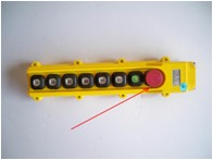 如图所示,该装置为起重机中常见的操控手柄,图中红色箭头所指的是红色按钮是什么?