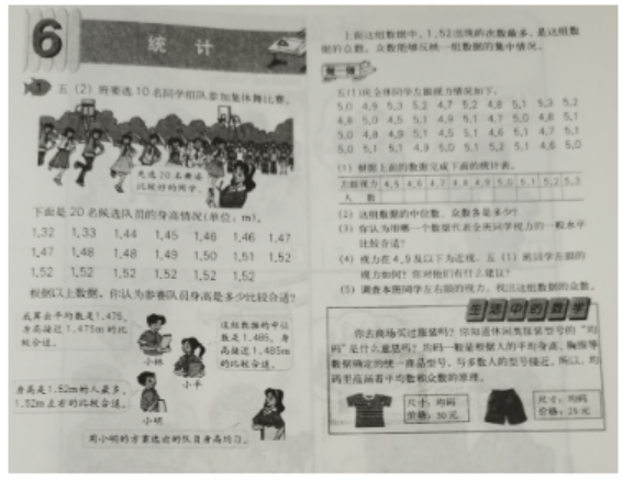 (1)概念:在一组数据中出现次数最多的数值,就叫众数。 特点:①众数在一组数据中出现的次数最多;②众数反映了一组数据的集中趋势,当众数出现的次数越多,它就越能代表这组数据的整体状况,并且它能比较直观地了解到一组数据的大致情况。众数是在统计分布上具有明显集中趋势点的数值,代表数据的一般水平,可以不存在或多于一个。 (2)①知识与技能目标:学生能够初步认识众数的概念,理解并掌握平均数、中位数以及众数的特点。 ②过程与方法目标:通过小组讨论,学生能够掌握众数的特点,并能将众数运用到实际生活中,培养学生操作能力和解决实际问题的能力。 ③情感态度与价值观目标:学生能够体验到利用数学解决实际生活问题的乐趣,并培养学生对数学的兴趣。 (3)教学过程: 一、导入:根据课本情景提问题 用课件出示课本中20名候补队员的身高情况,请学生们仔细观察,通过小组讨论,试着找出数据的特点。 二、新授:1.引导学生思考并计算出候补队员身高的平均数与中位数。 学生回答:候补队员身高的平均数:1.475米;候补队员身高的中位数:1.485米。 教师总结:平均数与中位数可以体现数据的一方面趋势,我们还可以通过数据出现的次数体现出数据明显的集中趋势。 ?2.小组合作,解决问题 ①老师想问问大家,在这组数据中,哪个数据出现的次数最多? ②学生讨论:1.52米出现的次数最多。 ③教师总结:.上面这组数据中,1.52出现的次数多,是这组数据的众数。 三、巩固与小结: 同学们都了解了众数的定义,那么请大家谈一谈,说一说,众数与平均数、中位数相比,有什么特点? 学生集体谈论:积极讨论。 教师总结:众数能够反映一组数据的集中情况。 设计理由:教师提出问题,学生自主发现,有利于活跃课堂气氛,培养学生自主学习能力。小组之间合作学习,有利于提高动手能力,培养学生解决问题的能力。通过对数据的整理与处理,让学生能够将数学与生活更加紧密的联系在一起。