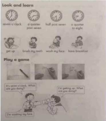 (1)教学重难点 教学重点:学生在呈现、操练、输出及复习巩固的各项活动中听、说、认、读新词汇。 教字难点:理解进行时的运用,并在对话中正确结合词汇进行运用。 (2)教学目标 1.知识目标: 1.1学生能够听懂、认读、识别本节课的重点词组 get up, brush my teeth, wash myface have breakfast。 1.2学生能够理解有关时间表达的句式结构,能理解进行时用于表达正做某事的结构。 -It's What are you doing -I'm。 2.能力目标 学生能够在真实的情景中灵活得体运用本节课的重点单词、句型,就时间主题进行问答。 3.情感目标 学生通过学习与生活紧密关联的主题,有效激发学习热情和参与积极性。并通过本节课的学习更好地了解自己和周围入的生活作息安排,有利于养成良好的生活习惯。 (3)教学过程 1.导入:猜谜游戏 教师呈现一个有关闹钟的谜语,引导学生猜测出闹钟,从而自然引出本节课的时间话题。 【设计意图】通过猜谜活动有效吸引小学生的注意力和学习兴趣,为本节课的学习做好了知识准备,有效达到“课未始,兴已浓”的效果。 2新授: 2.1教师多媒体呈现时钟,并结合动作呈现本节课的重点动词短语。学生理解单词的意思之后,教师引导学生边做动作边读单词。 2.2学生听录音跟读,教师纠正发音 【设计意图】 结合小学生的认知特点和本节课的重点词汇特点,教师采用全身反应法直观清晰地呈现了本节课的重点词汇。之后的跟读环节进一步帮助学生熟悉了解本节课的重点内容,为接下来的操练巩固做好语言准备。