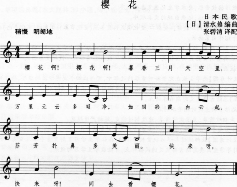 【教学目标】【情感·态度·价值观】 尊重艺术.体会日本民族音乐的特色.体会世界文化的多样性。 【过程与方法】 在音乐艺术的集体表演过程中,通过完整而充分地聆听歌曲,能够体会日本歌曲的独特魅力。 【知识与技能】 能够完整地演唱歌陆.逐步提高音乐审美能力。 【教学难点】 了解并认识Et本民族音乐的特色. 【教学过程】 1.新课导人 (1)播放动画《秒速五厘米》片段,在动画的场景中感受樱花徐徐飘落、片片凋零的纯净之美。 (2)请同学分享自己搜集到有关樱花的知识。教师展示与樱花有关的图片和音像资料. (3)教师引入介绍歌曲。 2.教授新课 (1)初步感知.聆听歌曲 ①学生初昕歌曲,感受歌曲的情绪.想象画面.并用画笔画下来。 ②教师引导学生说说歌曲的情绪(优美,抒情),并进行归纳总结。 ③老师弹唱,学生感受歌曲的速度(稍慢)。 (2)对比感受.学唱歌曲 ①学生识读乐谱,跟着老师的琴声学唱歌曲,注意音准的把握。教师纠正音准(注意3—4与4—3之间的小 二度,4—7之间的增四度、7—6—4,此下行学生最难把握的大二度、大三度)。 ②教师和学生一起完整地演唱歌曲。 ③教师播放音频,让学生再度欣赏,并提问:本首歌曲一共出现几个音.分别是什么? ④对比都节调式和五声调式。教师弹奏或演唱特定的几个音,帮助学生初步感受、建立日本“都节调式”的调式感觉。此时可带领学生复习、对比中国的五声调式。 ⑤老师播放旋律,要求学生结合之前所做的画作进行讲解分享,体会歌词所表达的意境。 ⑥加入歌词进行演唱,注意旋律上行渐强.下行渐弱。 【拓展延伸】 1.介绍日本乐器“三味线”“日本筝”。 2.根据日本歌舞伎视频,学习舞蹈.分组创编并进行表演。 【课堂小结】 教师:樱花的生命非常短暂,边开边落。短暂的花期正像人的生命一样转瞬即逝,日本人希望自己短暂的一生如樱花般灿烂。故赋予樱花纯洁、高雅、清秀、质朴的品格,更是勇敢独立的象征,希望同学们也具有这样的品质,带着对樱花的崇敬再来演唱一遍这首歌。