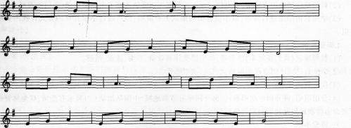 旋律写作: 要求: (1)分别以谱例中乐句作为第1句和第3句,创作第2句和第4句。 (2)完成后的结构为再现单二部曲式。