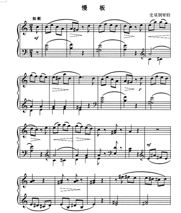 (1)此曲是一首再现的单二部结构的乐曲。曲式结构:A(8+8)+B(8+8);a小调转E大调转a小调。 (2)全曲四句由起承转合的结构原则构成,“起、承”两句彼此构成呼应,第三句“转”是对比.第四句的音乐材料aaba正是这样的起承转合。第一、二句为a小调,和声进行是T—D—T—S—D和T—D—S—D—T。两句的具体和弦仅最后不同:第一句是半终止,第二句是全终止。 非常清楚地属主呼应。句中的V65/IV是主到下属倾向性的加强,为主功能的延伸。第三句转到属调E大调,旋律先在低音部出现,后半句才转到高音部。在调性上和织体上都形成鲜明的对比,此句调性清晰、对比鲜明。第四句和第二句完全相同,对全曲具有总结性。