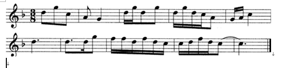 将下列旋律片段进行变奏改写。 要求: (1)用变奏的手法将谱例改变成3/8拍子的乐曲,可改变旋律风格,音乐形象需完整;(8分) (2)说明改变后由何种类型乐器演奏。(2分)