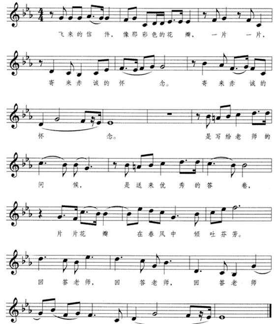 (3)A段为单声部,自然而近乎口语化的音乐主题于平易、亲切中饱含深情。弱起的节奏,朴实的音调及接下来的略为舒展的旋律,富于动感的音型伴奏下,恰似在“春风中”飘逸着的“片片花瓣”。B段与之对比,旋律提高了音区,但仍是以级进为主的平和的旋律进行,表达了对老师感怀的一种内心的激动。接下来为塑造“春风中”的意境,飘逸的旋律,至呼唤式的“回答老师”处达到了全曲的高潮。