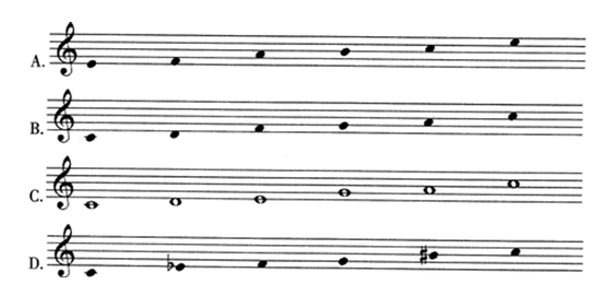 我们在观看日本电影和电视剧时常常会听到一种具有独特东洋韵味的音乐,它们的旋律多数是取材于日本都市的传统音乐,而都节音阶则是构成这种典型日本韵味旋律的基础,请问以下旋律哪一个为都节音阶?( )