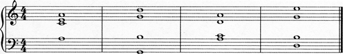 下列谱例中,属于密集排列的和弦有()个。