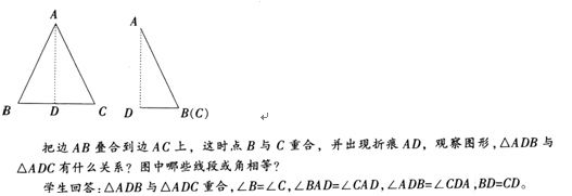 ??师生归纳:等腰三角形是轴对称图形,底边上的中线所在的直线是它的对称轴。(板书)教师说明:对称轴是一条直线,而三角形的中线是线段,因此不能说等腰三角形底边上的中线是它的对称轴。
