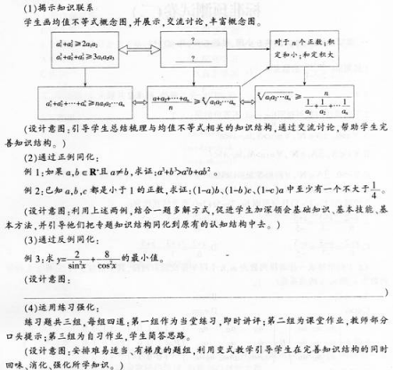 (4)上述教学过程,基本符合教学要求、学生实际,反映了新课程的基本理念。而且,教学过程设计比较具体,可操作性强,能保证教学目标的实现。但有两个环节不容易把握:一是对知识结构梳理;二是利用反例顺应。这两个环节也是引导学生进行高水平认知活动的重要环节,对于学生的不同想法,教师应只引申和明确,不能限制学生的思路,要给教学的动态生成以充分的空间和时间。