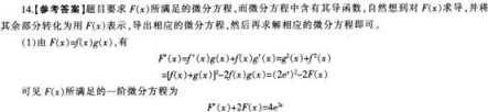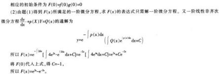 设F(χ)=f(χ)g(χ),其中函数f(χ),g(χ)在(-∞,+∞)内满足以下条件:f’(χ)=g(χ),g’(χ)=f(χ),且f(0)=0,f(χ)+g(χ)=2eχ。(1)求F(χ)所满足的一阶微分方程;(2)求出F(χ)的表达式。