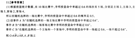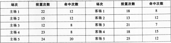 李明在10场篮球比赛中的投篮情况如下(假设各场比赛互相独立): (1)从上述比赛中随机选择一场,求李明在该场比赛中投篮命中率超过0.6的概率。 (2)从上述比赛中选择一个主场和一个客场,求李明的投篮命中率一场超过0.6,一场不超过0.6的概率。