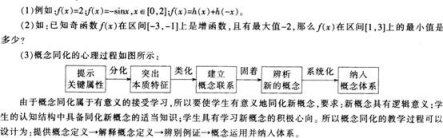 案例: 概念同化指从已有概念出发,理解并接纳新概念的过程,实质是利用演绎方式理解和掌握概念。由于数学中大多数概念是以属概念加种差的方式定义的,所以适宜采用概念同化的方式进行教学。以“奇函数,,概念教学为例简要说明概念同化的教学模式: (1)向学生提供“奇函数”概念的定义 (2)解释定义中的词语、符号、式子所代表的含义 突出概念刻画的是:对定义域中的任意一个自变量菇,考察χ与-χ对应的函数值f(χ)与f(-χ)之间的关系以f(-χ)=-f(χ)。因此函数的定义域应该关于原点对称,满足这个条件后再考察f(-χ)=-f(χ). (3)辨别例证,深化概念 教师向学生提供丰富的概念例证,例证中以正例为主,但也要包合适"-3的反例,尤其是一些需要考察隐含条件的例子。 (4)概念的运用 提供各种形式来运用概念,达到强化对概念的理解,促进概念体系的建构的目的,可以利用个别有一定综合性但难度不大的问题。 问题:(1)请举出反例说明(3)辨别例证,深化概念。(5分) (2)请举例补充(4)概念的运用。(5分) (3)请结合案例,总结出概念同化的教学模式的过程。(10分)