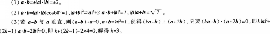 (1)若a//b,求a·b; (2)若a、b的夹角为60。,求la+bl; (3)若a-b与a垂直,求当k为何值时,(ka-b)垂直(a+2b)。