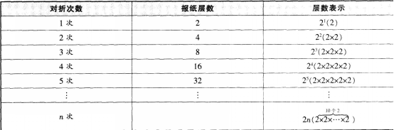 学生折叠并思考,教师巡视并提问。归纳出每一次对折后的层数都是上一次对折层数的2倍.概括了层数和对折次数的关系及表示方法,填入下表中:
