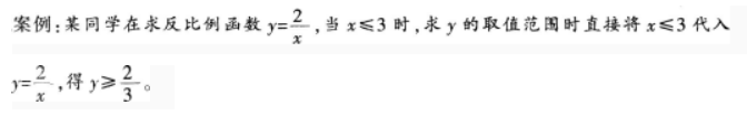 (1)该同学没有考虑x<0的情形; (2)教学片段: 师:我们知道函数是有定义域的,那么函数y=2/x的定义域是什么 生:x大于0或x小于0。 师:是的,那么同学可以画出它的图像吗大家试试。 师:当x≤3时y的取值范围是什么呢 师:是不是还要考虑x小于0的情形呢 生:是…… 师:那么当x≤3时Y的取值范围是什么呢 生:y≥2/3或y<0 师:很好,大家以后解题时一定不要急于求成,而要认真地思考。 设计意图:让学生在解关于函数的题型时首先要考虑函数的定义域,在定义域上研究函数。 (3)防范这种错误的方法是结合图像,注意反比例函数的图像是两支,在每一个象限内的情形要分开来解决。