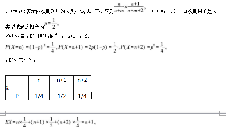 某单位招聘面试,每次从试题库调用一道试题,若调用的是A类型试题,则使用后该试题回库,并增补一道A类型试题和一道B类型试题入库,此次调题工作结束;若调用的是B类型试题,则使用后该试题回库,此次调题结束。试题库中现有n+m道试题,其中有n道A类型试题和m道B类型试题,以x表示两次调题工作完成后,试题库中A类型试题数量。 (1)求X=n+2的概率; (2)设n=m,求X的分布列和均值.