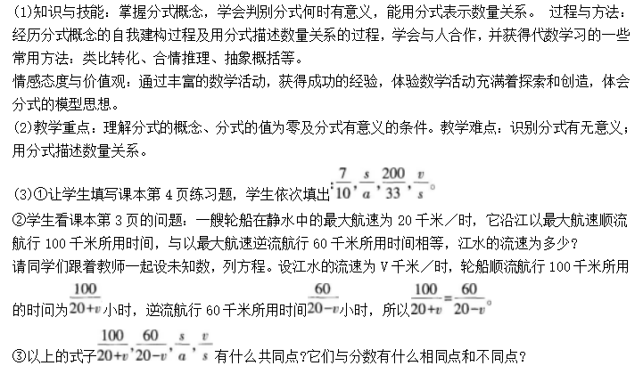 新课程内容标准中对第三学段中整式与分式的具体目标设置为“了解分式的概念,会利用分式的基本性质进行约分与通分,会进行简单的分式加、减、乘、除运算”,结合上述内容,对“分式(第一课时)”进行教学设计。 (1)本节课的教学目标是什么 (2)本节课的教学重点和难点是什么 (3)请为本节课的教学设计一个课程导入。