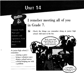 Teaching Content: A listening material about "I remember meeting all of you in Grade 7". Teaching Objectives: (1) Knowledge objectives ①Students can consolidate the usage of remember and the sentence pattern "I remember doing sth". ② Students can be more familiar with the topic of memories. (2) Ability objectives According to study, students can improve their skills of listening for specific information and can talk about the meaningful and unforgettable memories in English freely. (3) Emotional objectives ① Students can find out some meaningful memories from the past experience to encourage themselves studying hard. ②Students can understand we should cherish present and do our best to create a bright future. ③ Students can improve the confidence of learning English, and are not afraid of speaking English. Teaching Key Points: How to make students improve their skills of listening for specific information. Teaching Difficult Point: How to make students use the knowledge they learnt before to talk about the things happened in the past. Teaching Aids: a tape recorder, multimedia, pictures Teaching Methods: Communicative Approach, Task-based Teaching Method, Audio-Lingual Approach. Teaching Procedures: Step 1 Lead-in (5 minutes) The teacher shows some photos about students' junior high school and play the music named"Seasons in the Sun" to let students look back on their junior high school memories, and told them today they are going to learn to express their memories in English. T: (after listening) Now, who can tell me what's the subject of this song S: About youth. T: Yes, it's about youth. Very good. This is the last unit of our English book. In this unit, we will mainly talk about our past school lives. (Justification: This step could attract students' attention and lead in the new lesson easily.) Step 2 Pre-listening (10 minutes) Teacher asks students to look at the picture in this unit, and asks students to finish the task in la. Then asks students to check the things they remember doing at junior high school and add more things they remember as much as possible. T: Now, look at the picture. What kind of party do you think it is Is it a welcome party or graduation party S: Graduation party. T: Look at the small pictures. What are the boy and girl talking about Try to guess! S: (Discussing) T: OK. Let's look at the small scenes in this big picture. What does the girl remember doing According to the pictures, please have a guess and finish the task in la. Do you understand S: Yes! T: And you are supposed to write down some more items about what you remember doing in your past school time. Ok, now, let's do it. (Justification: This step can attract students' attention and help and encourage them to foucus on the content of what they are about to hear.) Step 3 While-listening (13 minutes) (1) Teacher asks students to listen to the tape and match the memory with the person. Then asks them to tell their answers to their partners. T: Ok, now, let's move on to our listening. Listen to the tape and match the memory with the person. And tell your answer to your partner by using sentences, such as, Peter remembers doing homework carefully to meet the standards of a strict teacher. Are you clear S: Yes! T: Now, let's begin! Students listen to the tape. T: Ok, now, who can tell us your answers SI: Sarah remembers losing a schoolbag ... T: Ok, very good. Sit down, please. $2: ... (2) Then the teacher plays the tape again, and asks students to read after the record. T: Now, I will play the record again and you are supposed to read after the record silently. Any questions S: No.: T: Ok, now, please listen to the tape. While listening, please pay more attention to the pronunciation and intonations. (Justification:This step make students listen and enjoy what they are listening. The task of matching the memorizing and with the person makes students focus on the listening itself. ) Step 4 Post-listening (12 minutes) (1) The teacher asks students to make a dialogue with their deskmates by using the list in la. T: Now, you are supposed to make a dialogue with your deskmate according to the list you wrote in la. Here is a conversation structure, you can make your dialogue according to it. (Then the teacher writes the example on the blackboard.) Example: --What do you remember doing --I remember doing my homework very late till to 12 o'clock. What do you remember doing --Well, I remember winning a prize. And my parents took me to the biggest amusement park in our city. --Wow!It's cool. What else do you remember --I still remember playing basketball on the playground with you and singing songs with our best friends. --Yes, wonderful and colorful. The teacher chooses one student and his/her deskmate to present their dialogue in front of the class and gives some feedback. (2) T: Now, look at the chart on PPT, I need you to make an interview. Interview some classmates and record at least three memories of thetn. Then fill the chart and make dialogue with your deskmates. Any questions S: No. T: Good. Let's do it. After finished, I will invite three groups to share their dialogues, and the best group will get a reward. (Justification: This step is easier for students' to have a high motivation to speak. According to their make dialogue with their deskmates can test the students' listening comprehension.) Step 5 Summary and Homework (5 minutes) Summary: Ask students to think about the key sentence structures they listened today, and then make a short summary. Homework: Ask students to look back on their school life, and communicate these colorful feelings with their friends. Blackboard Design: Unit 14 I remember meeting all of you in Grade Pre-listening: While-listening: Post-listening: Example: --What do you remember doing --I remember doing my homework very late till to 12 o'clock. What do you remember doing --Well, I remember winning a prize. And my parents took me to the biggest amusement park in ou