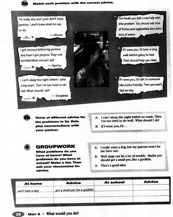 Teaching Content: Some dialogues about giving advice and making conversations about it. Teaching Objectives : Knowledge objective (1) Key Vocabulary pimple, trouble (2) Target Language A: I can't sleep the night before an exam. Then I'm too tired to do well. What should I do B : If I were you, I' d take a long walk before going to bed. A: I really want a dog, but my parents won't let me have one. B : Well, dogs can be a lot of trouble. Maybe you should get a small pet, like a goldfish. A: That's a good idea. Ability objective Students can improve their reading and integrating skills. Emotional objective Students can know that everyone may have some trouble, and tell them not to worry about that. Teaching Key Points: Understand the content of the dialogue and master the vocabulary and target language. Teaching Difficult Point: Use the target language properly. Teaching Aid: The blackboard Teaching Procedures : Step 1 Revision (3 minutes) Check homework. Get students to talk about what they learned last time. (Justification: The revision will examine students' learning effect and easily lead in the text.) Step 2 Presentation (25 minutes) 3a (10 minutes) Point to the problems on the left. Ask different students to read them to the class. Point out the pieces of advice on the right. Get different students to read the problems and the pieces of advice to the class. SA: I'm really shy and I just don't enjoy parties. I don't know what to say or do. Ss : If I were you, I' d like talk to someone who looks friendly. Then you won' t feel so shy. T: Please match each problem on the left with the correct advice on the right. Get students to complete the activity on their own. As they work individually, move around the room answering any questions students raise and offering help as needed. Check the answers. Answers 1. C 2. a3. b (Justification: The process of this step provides reading practice using the target language.) 3b (15 minutes) Read the instructions to the class. Invite a pair of students to read the sample conversation. SA: I can't sleep the night before an exam. Then I'm too tired to do well. What should I do SB : If I were you, I' d take a long walk before going to bed. That would help you relax. T: Please think of different advice for the problems in Activity 3a. Collect suggestions from students. For example, for the third problem, a student might say, "if I were you, I' d watch TV to relax my mind." Ask students to make conversations with partners using new suggestions to each problem. As they work in pairs,walk around the room offering language support as needed. Mter each student has a chance to play both parts, stop the activity. Get several pairs of students to show their conversations. (Justification: The process of this step provides oral practice using the target language.) Step 3 Practice (12 minutes) Read the instructions to the class. Get a pair Of students to show the sample conversation to the class. SA: I really want a dog, but my parents won't let me have one. SB : Well, dogs can be a lot of trouble. Maybe you should get a small pet, like a goldfish. SA: That's a good idea. Write the conversation on the blackboard. Point out the sample answers in the chart. T: What problems do you have at home or at school Make a list in the chart. Then ask your classmates for advice and write their advice in the chart too. Get students to complete the activity in groups of four. As the groups work together, move around to make sure students discuss the topic in English and know how to fill in the chart. Check the answers by asking different pairs of students to show their conversations to the class. Answers will vary. Optional activity T: What would you do if there were no classes tomorrow Ask students to write as many answers as they can. Then get students to work in pairs. (Justification: The process of this step provides writing, listening and speaking practice using the target language. ) Step 4 Summary and Homework (5 minutes) Summary : In this class, we' ve done a lot of reading, speaking and writing practice using the target language. Homework : (1) Review the target language by reading the conversations in Activity 3a. (2) Write a composition entifled"What would you do when you in trouble". (Justification: The summary gives a specific conclusion of this class and the justification of homework is to cultivate the students' ability of writing down their ideas.) Blackboard Design : Unit 4 What would you do Section A The Third Period Target Language: A: I can't sleep the night before an exam, Then I'm too tired to do well, What should I do B : If I were you, I' d take a long walk before going to bed. A: I really want a dog, but my parents won't let me have one. B: Well, dogs can be a lot of trouble. Maybe you should get a small pet, like a goldfish. A: That' s a good idea.