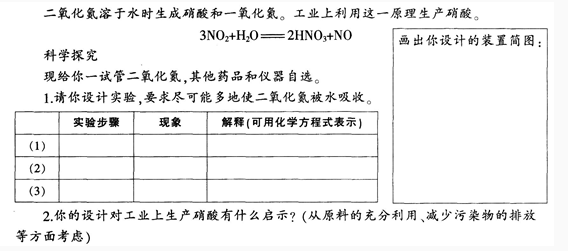 材料一《普通高中化学课程标准(实验)》关于“二氧化氮和一氧化氮”的内容标准是:通过实验了解氯、氮、硫、硅等非金属及其重要化合物的主要性质,认识其在生产中的应用和对生态环境的影响。