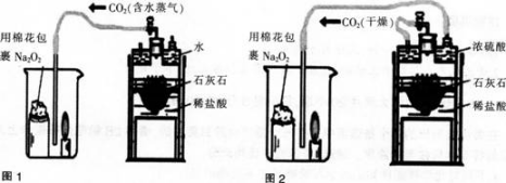 (1)在一个500?mL的烧杯里粘一段蜡烛头,再倒放一只50?mL的小烧杯。小烧杯上放一片铁片,防止棉花燃烧把小烧杯烧裂,点燃蜡烛,把包了过氧化钠固体的棉花放在小烧杯上,用沉浮式气体发生器制取二氧化碳(如图l所示),随着二氧化碳向大烧杯里注入.我们会看到燃烧的蜡烛首先熄灭,片刻后棉花燃烧起来。