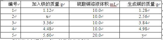 为了探究铁和硫酸铜溶液反应中量的关系,某兴趣小组做了五组实验,实验结果记录如下: 则表格中记录的x和y的数值应分别为