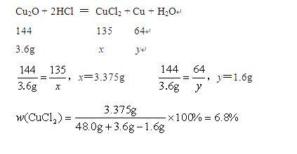 某兴趣小组同学在一份资料中了解到:铜有CuO和Cu2O(红色)两种常见的氧化物。因为Cu和Cu2O均为红色,故他们猜测,在H2还原CuO所得的红色产物中可能含有Cu2O。 ⑴该小组同学准确称取了8.0g黑色CuO粉末放入大试管中,不断通入足量的H2,在加热条件下进行还原,如果产物只有Cu,其质量应为(). ⑵该小组在H2还原CuO时,当发现8.0g黑色CuO粉末全部转变成红色时,停止加热,冷却后称得固体质量为6.8g。此红色固体中氧元素的质量为(),以此推得Cu2O的质量为(). ⑶将⑵中所得的6.8g固体放入烧杯中,加入48.0g过量稀盐酸(Cu2O与稀盐酸的反应为:Cu2O+2HCl=CuCl2+Cu+H2O),充分搅拌,除有红色固体外,还发现溶液变蓝。试计算此蓝色溶液中CuCl2的质量分数。