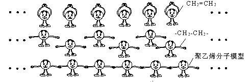 (3)化石燃料不仅是优质的能量资源,还是宝贵的化工资源。聚乙烯是一种最常用的塑料,它是以石油裂解气体乙烯(CH2=CH2)为原料,经许多乙烯分子打开双键(-CH2-CH2-)连在一起,聚合成大分子而形成的。下图是聚乙烯分子形成过程的示意图,卡通画中单个小人代表一个乙烯分子。聚乙烯其中的部分结构可表示为:…()…。
