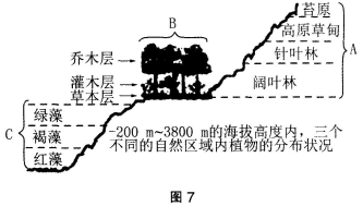 如图7, A、 B、C分别代表山地、森林、海洋三个不同的自然区域内植物的分布状况。据此判断下列选项中正确的是()。