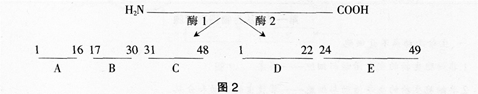 蛋白酶1作用于苯丙氨酸(C9H11NO2)羧基端的肽键,蛋白酶2作用于赖氨酸(C6H14N2O2)两侧的肽键,某四十九肽经酶1和酶2作用后的情况如图2,下列叙述正确的是()。 A.此多肽中含2个赖氨酸