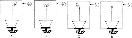 在方形暗箱的右侧开一小窗,暗箱外的右侧有一固定光源,在暗箱内放一盆幼苗,花盆能随着下面的旋转器水平匀速旋转,但暗箱不转,一周后,幼苗的生长状况应为( )。