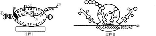 【知识点】本题考查基因的复制和表达。 【答案】 (1)RNA聚合酶:脱氧核糖 (2)细胞核;← (3)AGACTT;UAG (4)可以提高蛋白质合成的效率 【解析】(1)根据碱基的种类可以判断,过程l是以DNA。的一条链为模板,合成mRNA的过程,是遗传信息的转录过程,图中甲的名称为RNA聚合酶。乙是DNA单链上的胞嘧啶脱氧核糖核苷酸,丙是RNA单链上的胞嘧啶核糖核苷酸,在组成上的不同之处在于乙含有的五碳糖是脱氧核糖.丙含有的是核糖。 (2)过程1是以DNA为模板的,所以发生的主要场所是细胞核。根据RNA聚合酶的位置和mRNA的延长方向可以判断图中转录过程进行的方向是“卜”.即从右往左进行。 (3)若过程Ⅱ的多肽链中有一段氨基酸序列为“ —丝氨酸—谷氨酸—”,携带丝氨酸和谷氨酸的tRNA上的反密码子分别为AGA、CUU,可知mRNA上对应的碱基序列为UCUGAA.则对应DNA①中模板链碱基序列为AGAC3TT。若该多肽合成到UGC决定的氨基酸后就终止合成.由过程Ⅱ的@mRNA上的碱基序列和翻译方向可知.UGC密码子右侧的3个碱基是UAG,其不决定氨基酸,则导致合成结束的终止密码子是UAG。 (4)过程Ⅱ在进行时,物质②上可结合多个核糖体,其意义是可以同时进行多条肽链的合成.使少量的mRNA分子就能迅速合成大量的蛋白质。
