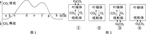 下图1表示夏天某一晴天一昼夜中某棉花植株C02的吸收和释放曲线;图2表示该棉花叶肉细胞中两种细胞器的四种生理活动状态。则图1中时间a,b、c、d依次发生了图2所示的哪项生理活动( )
